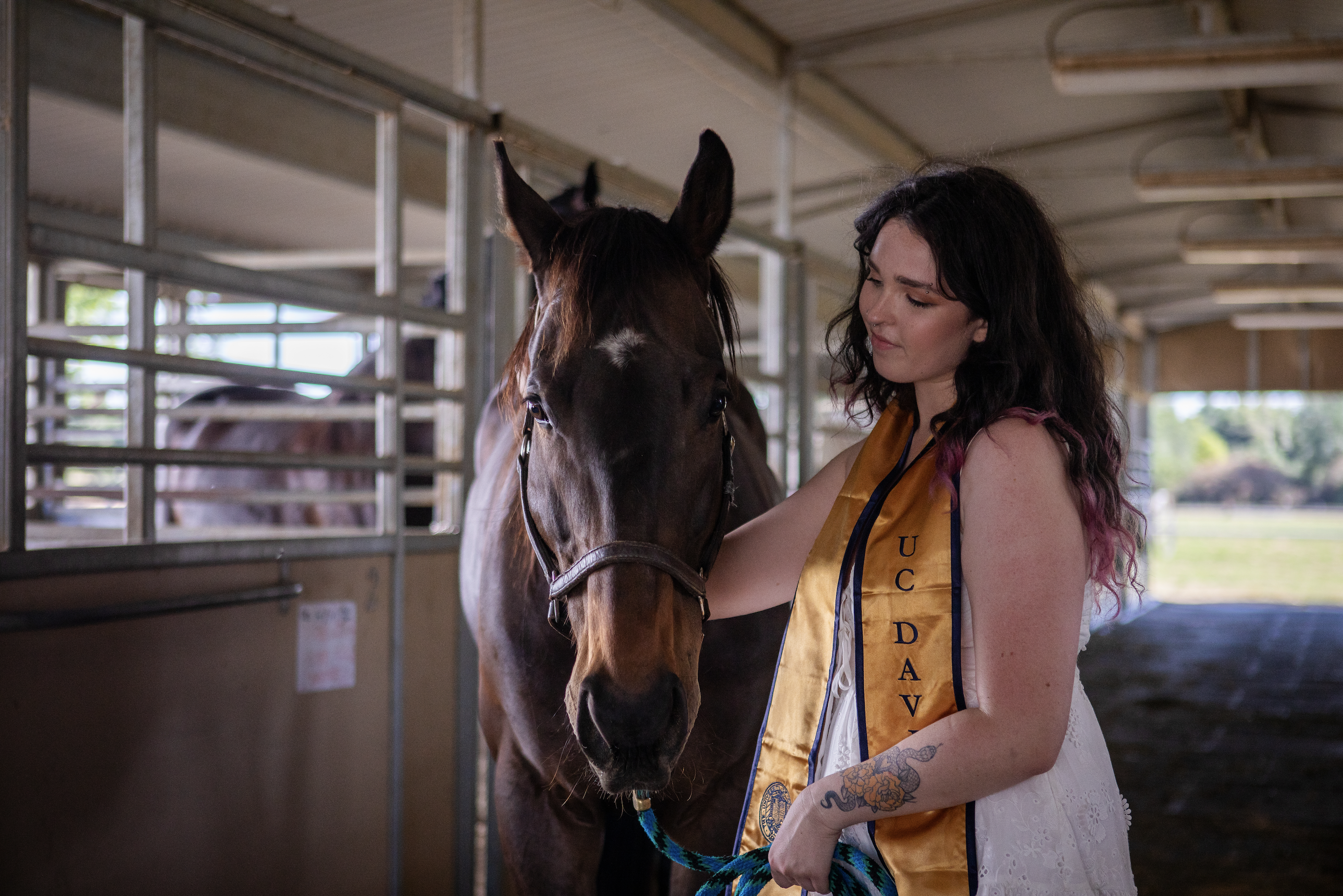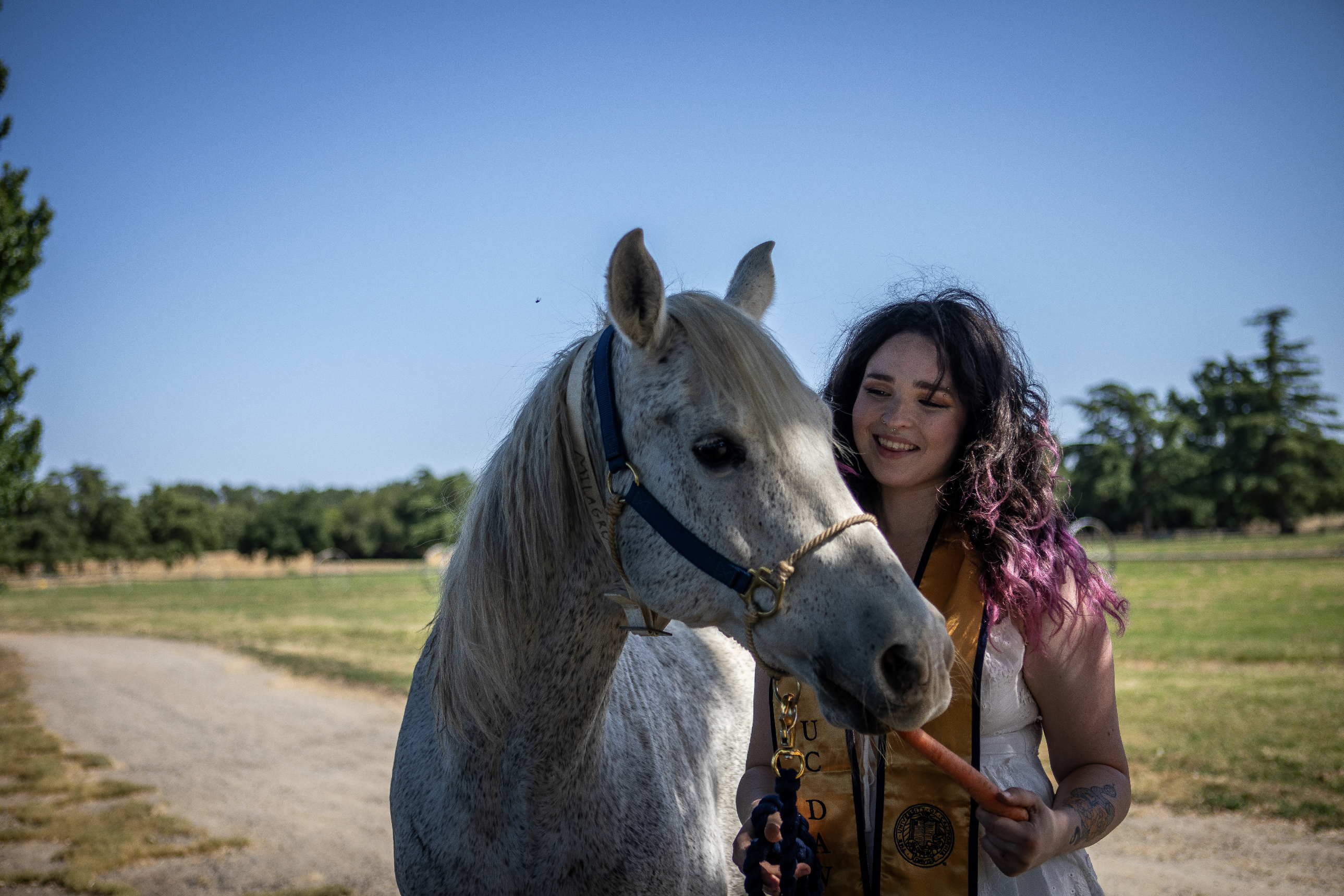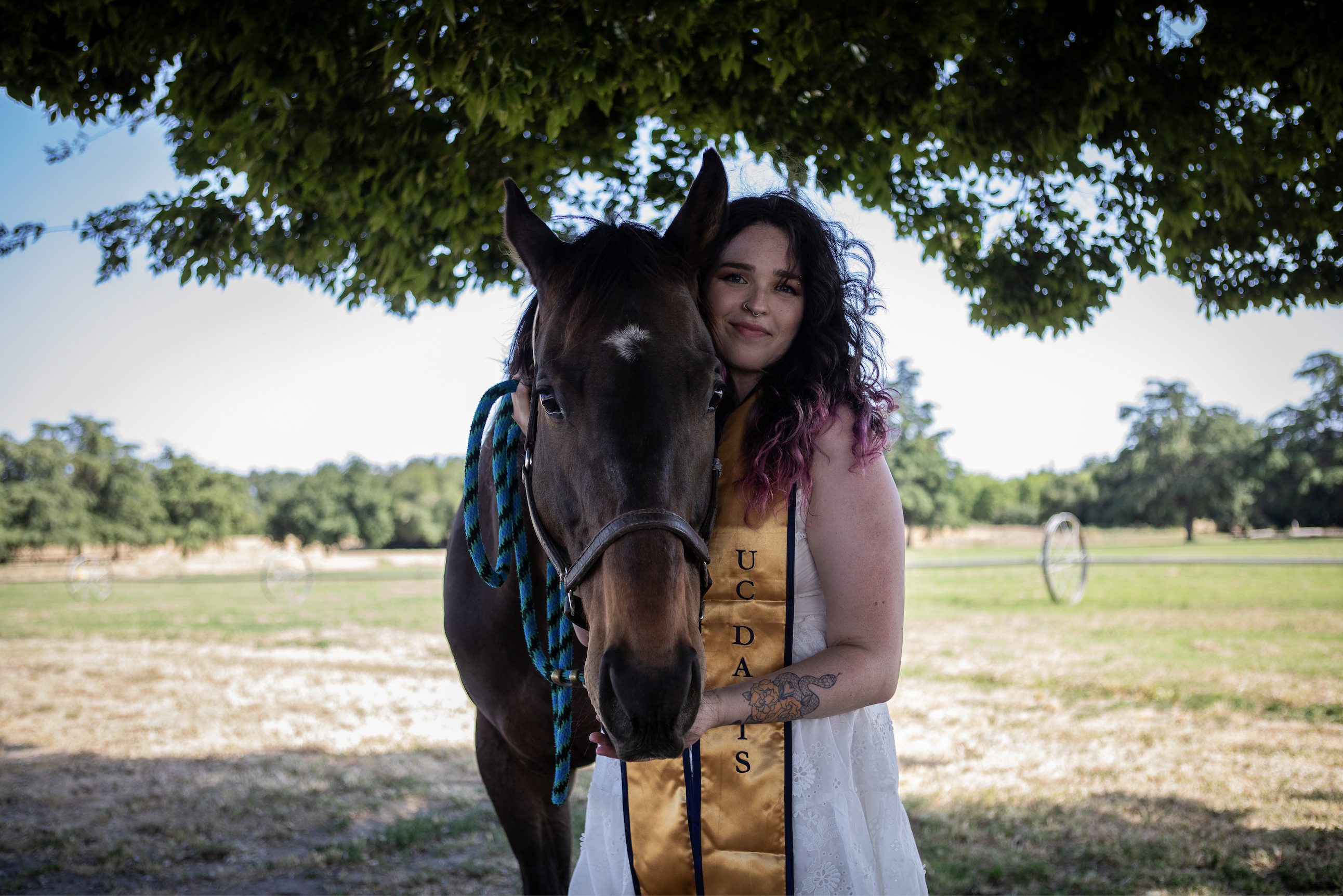 Savannah’s graduation shoot has to be the most unique photoshoot I’ve ever done. Over the span of three separate days, I captured shots of her not only by herself, but also of her interacting with some of the horses that participate in the Guardian Angel program at the UC Davis Equestrian Center, her dog Apollo, and Grasshopper the Swainson’s Hawk, who is one of the sweetest educational ambassadors at the California Raptor Center. In total, I captured easily over 100 photos, narrowed it down to 70 beautiful shots, and will be sharing my top 25 favorite photos in this blog post.